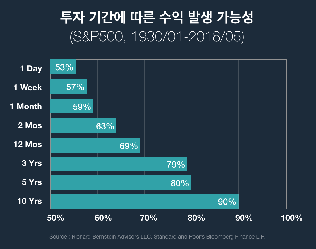 두 번째는 '내 자산에 주어진 시간 (투자기간)'입니다. 투자기간이 짧은 경우, 일시적이나마 손실을 경험할 확률이 높아집니다. 예를 들어 S&P 500 (페이스북, 애플, 아마존 등 미국 500대 주요 기업을 포함하는 대표 지수)에 대한 투자의 경우, 투자기간이 길수록 수익을 경험할 확률이 90%에 가까워짐을 확인할 수 있습니다.