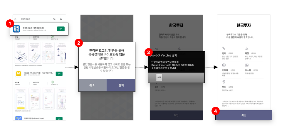 1) 한국투자증권(계좌개설 포함) 앱을 설치합니다. 2) 앱을 실행하면 바이오인증 앱을 설치하라는 안내가 나옵니다. 설치합니다. 3) 마찬가지로 보안을 위한 백신도 설치합니다. 4) 원활한 앱 이용을 위해 내 휴대전화의 일부 권한을 허용합니다.